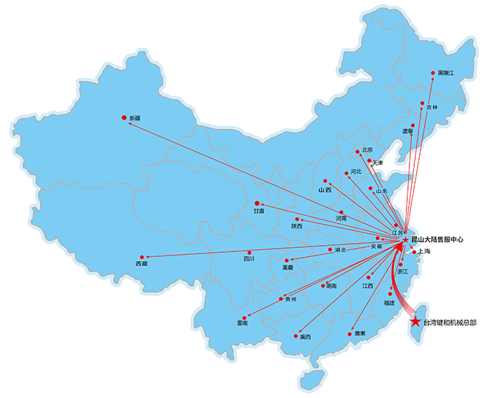 昆山嘉尼赫機械有限公司為臺灣鍵和機械股份有限公司在大陸設定的唯一子公司,本公司于2010年4月在昆山仕泰隆模具城成立,應市場需求于2015年2月搬遷至昆山周市鎮成立鍵和中國售服中心。設有獨立的零配件倉庫及機臺大修車間,機臺樣機展示廳。